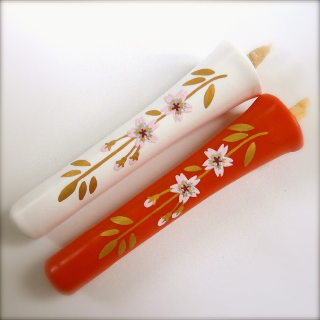 米糠から造られた植物性原料の和ろうそくに手描きで1本1本絵を描いています。