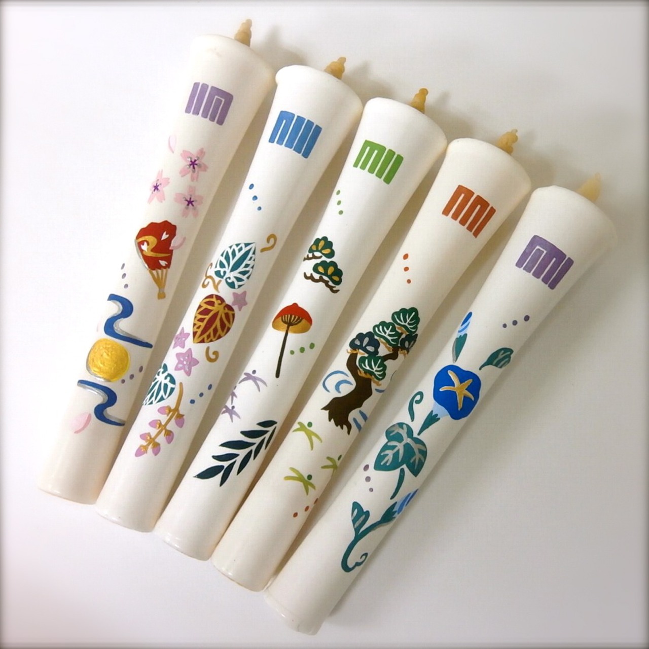 米糠から造られた植物性原料の和ろうそくに手描きで1本1本絵を描いています。