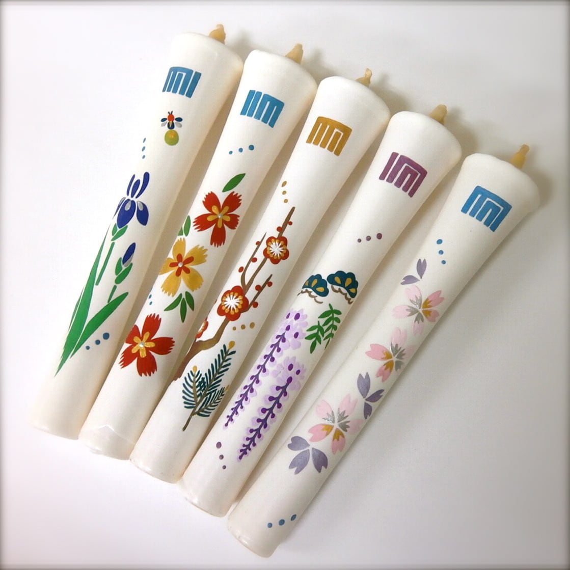 米糠から造られた植物性原料の和ろうそくに手描きで1本1本絵を描いています。