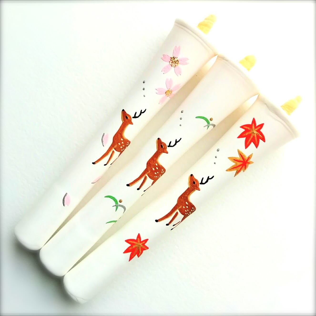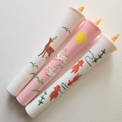 米糠から造られた植物性原料の和ろうそくに手描きで1本1本絵を描いています。