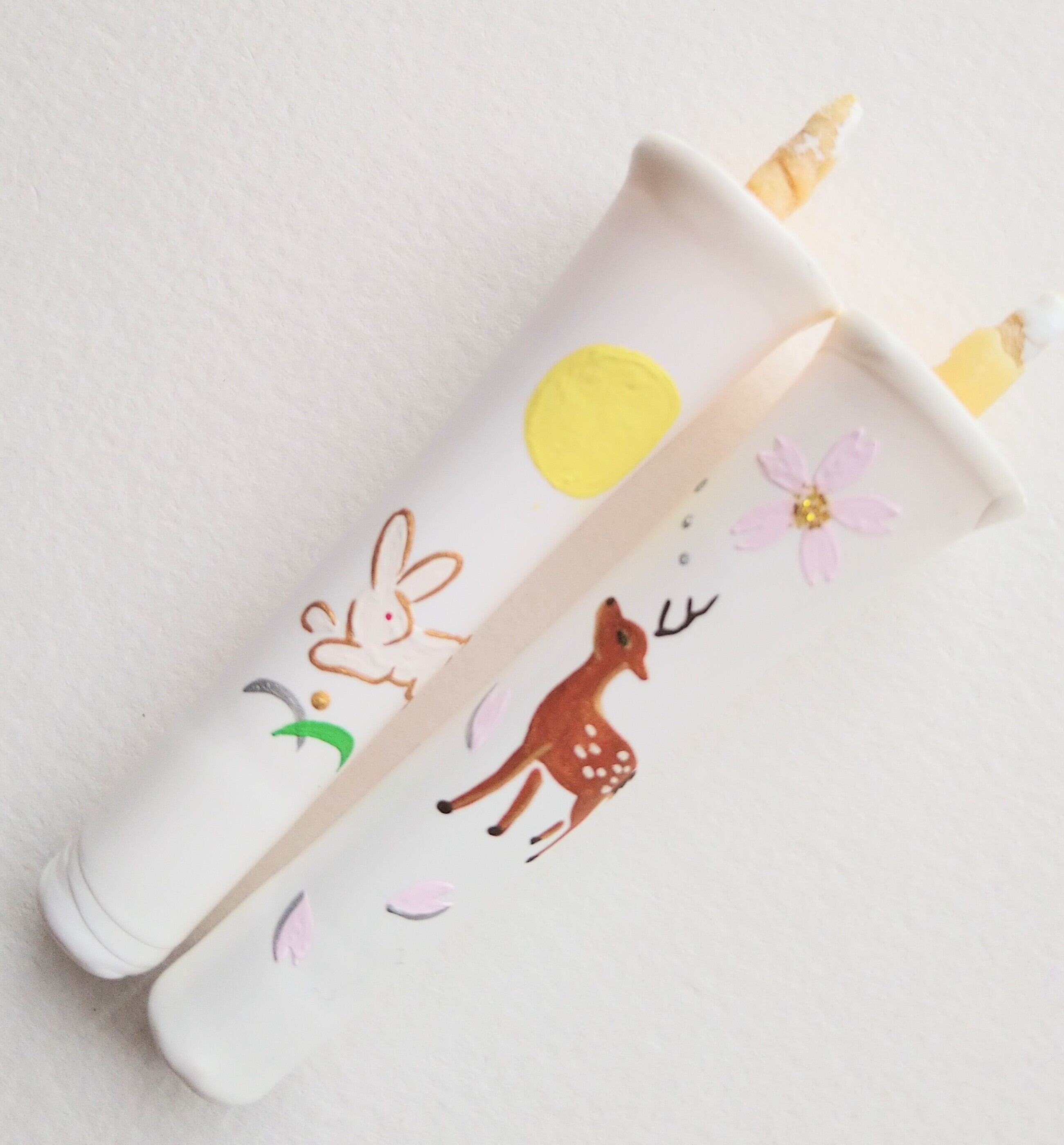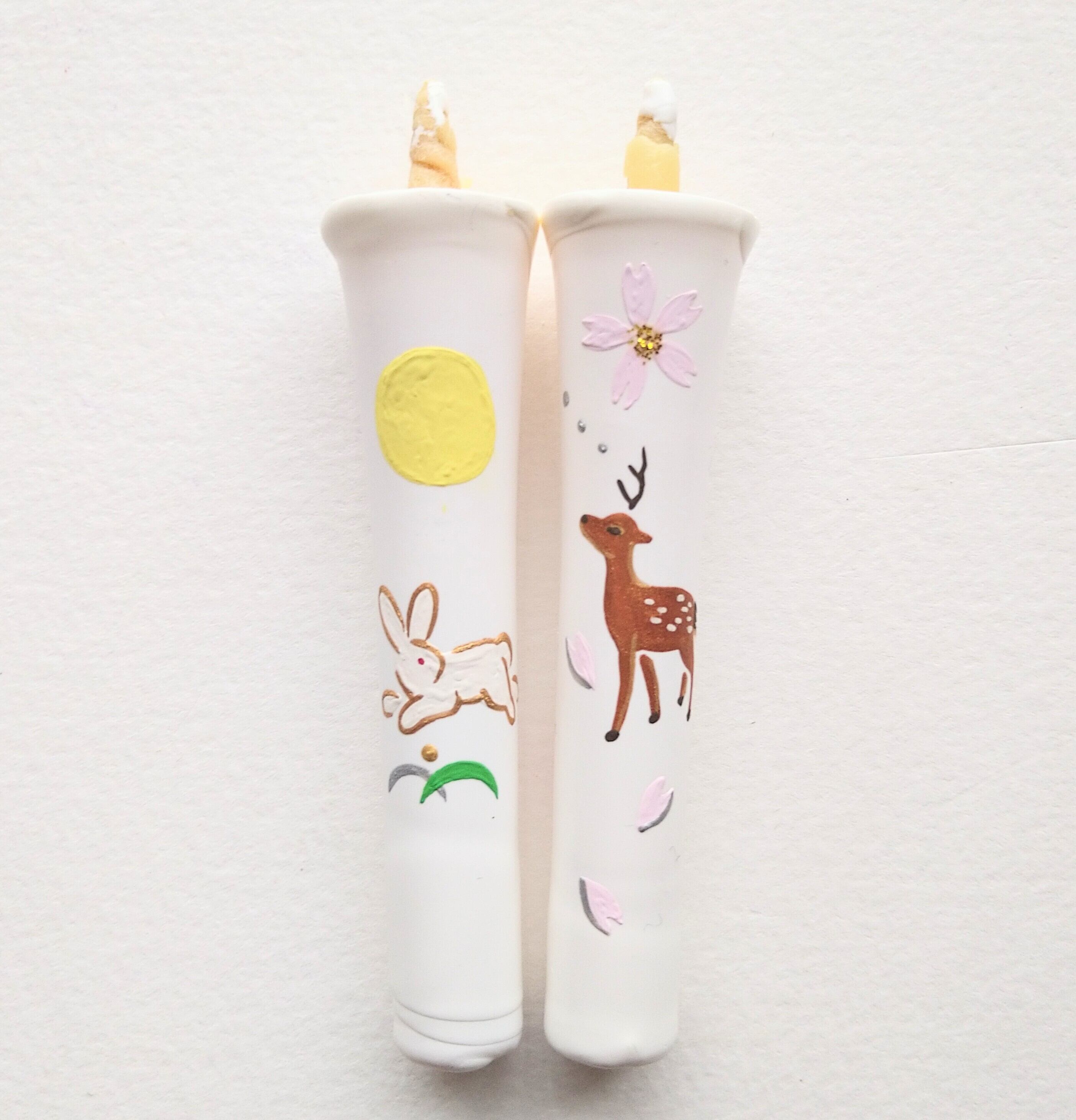 米糠から造られた植物性原料の和ろうそくに手描きで1本1本絵を描いています。