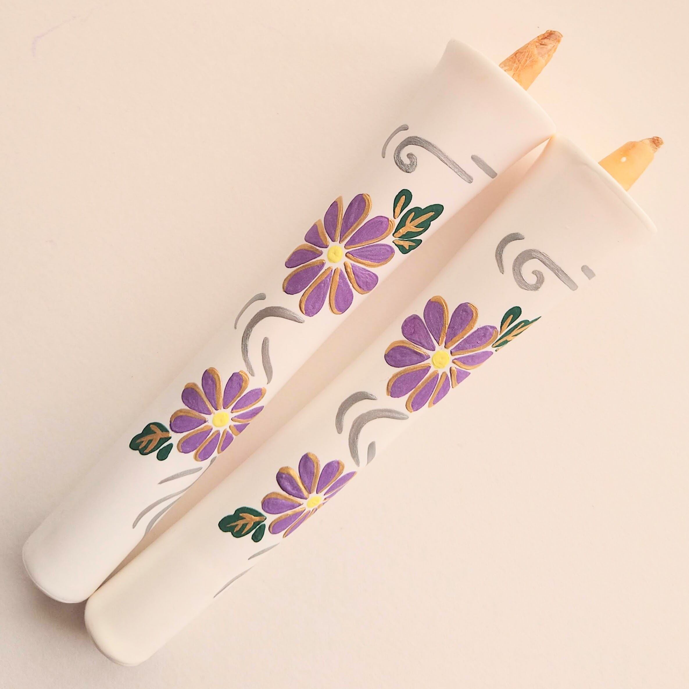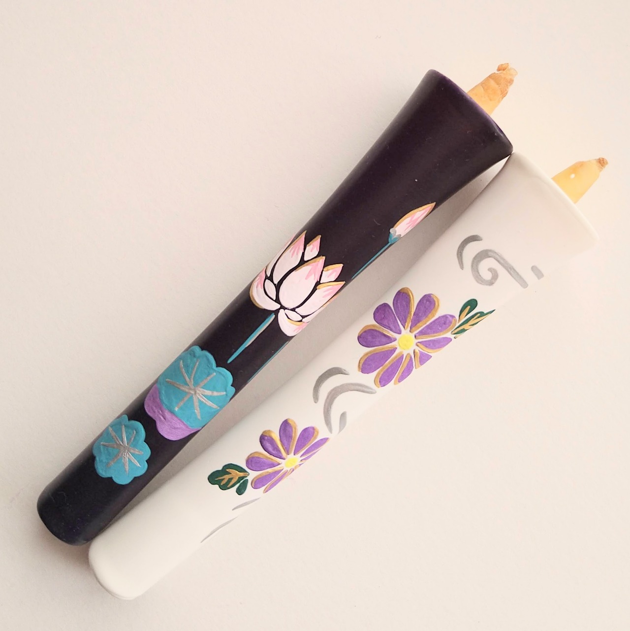 米糠から造られた植物性原料の和ろうそくに手描きで1本1本絵を描いています。
